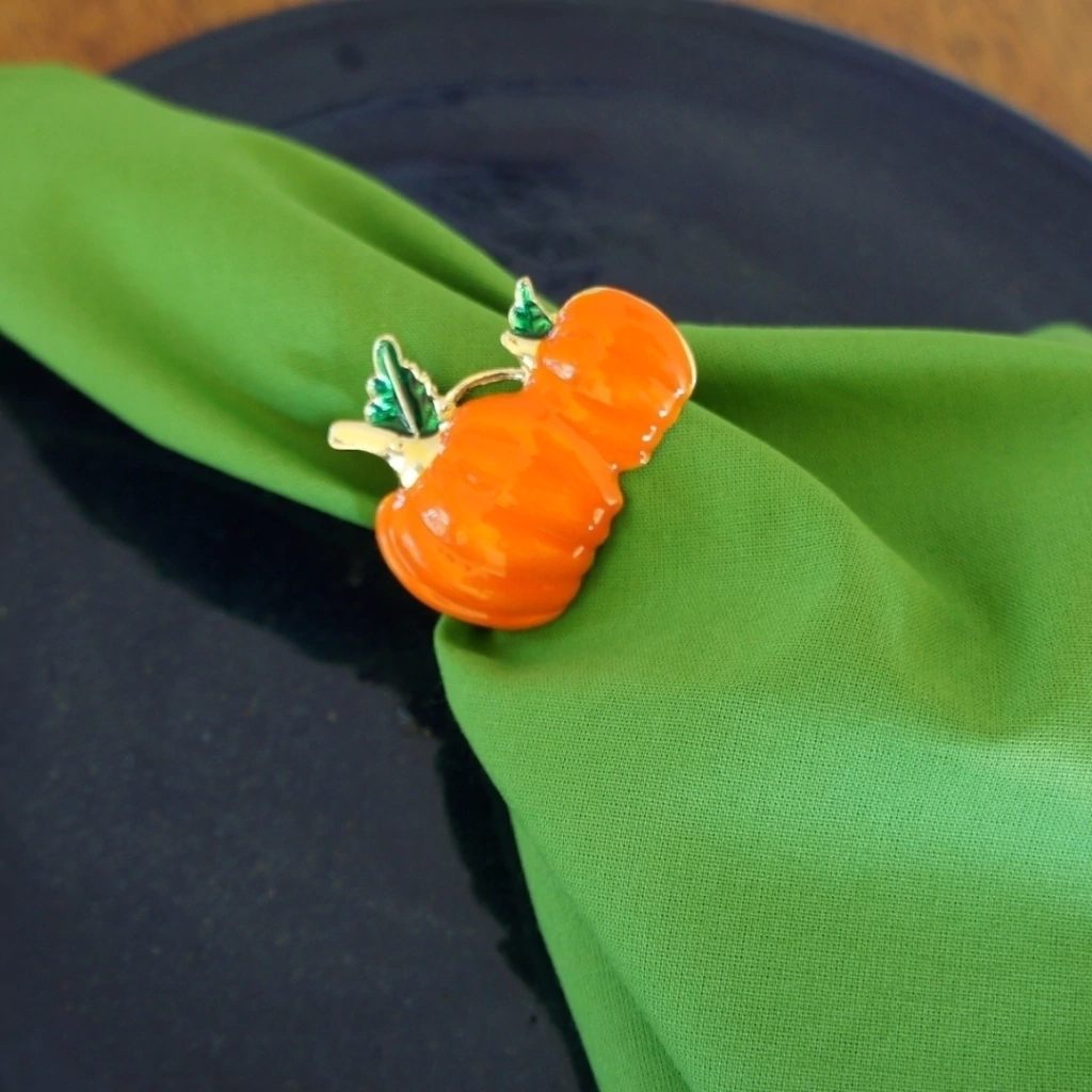 Este porta guardanapo combina metal dourado com uma charmosa abóbora esmaltada, criando um acessório elegante e funcional para suas refeições. Ideal para dar um toque sofisticado e temático à sua decoração.