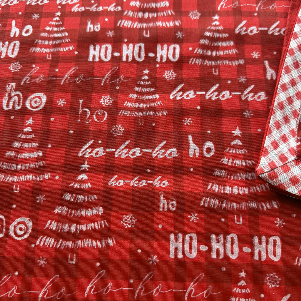 Traga o espírito natalino para sua mesa com a Toalha Retangular Ho Ho Ho! Com uma vibrante estampa em vermelho, esta toalha possui adoráveis motivos natalinos, incluindo as divertidas palavras "ho ho ho" e lindas árvores de Natal em prata.